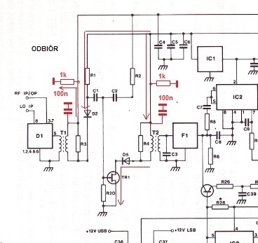 Trzydzieści pięć lat temu, kiedy ten transceiver został zaprojektowany, J310, działający z zerową polaryzacją bramki, był najlepszym niedrogim wyborem dla nisko szumowego wzmacniacza o niskich zniekształceniach przy 9 MHz. Jego impedancja wejściowa wynosi 4 pF bocznikowane przez rezystor polaryzacji bramki 22k, który nie ma znaczącego wpływu na terminowanie miksera lub filtra. To wciąż dobry wybór, poza dość wysokim prądem drenu. Załączone schematy pokazują ścieżki nadawania i odbioru Transceiver G4CLF. T1 ma stosunek przekładni 1:3, więc dla prawidłowego miksera zakończenie transformator powinien być obciążony 450 omami. Podczas odbioru obciążenie to faktycznie R1, R2 i R3 równolegle = 452 omów, co jest prawidłowe, ale podczas transmisji obciążenie wynosi tylko R3 (= 560 omów), co jest ponad 20% za wysokie i nieznacznie pogorszy wydajność IMD miksera - na szczęście jest to mniej ważne podczas nadawania niż podczas odbioru. Filtr kwarcowy powinien być zakończony 500 omami i 25 pF. Podczas transmisji jest zakończony równolegle przez R1, R2 i R4 co jak już widzieliśmy wynosi 452 omów – to o 10% za mało, a w trakcie odbioru tylko przez R4, 560 omów - 10% za wysokie. Ta niezgodność 10% nie ma większego znaczenia ani wpływu na wydajność filtra.
