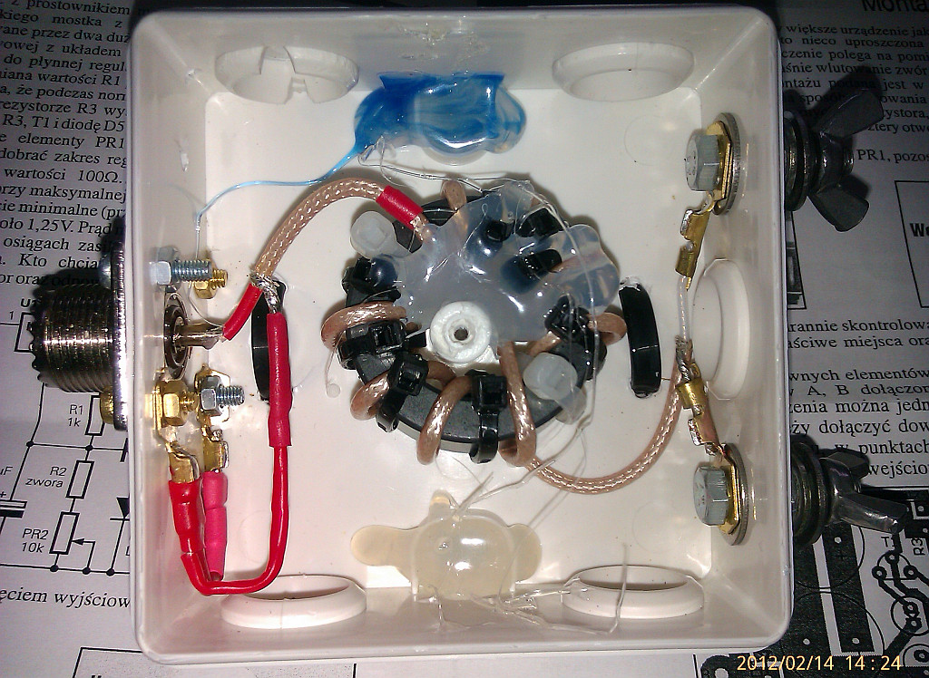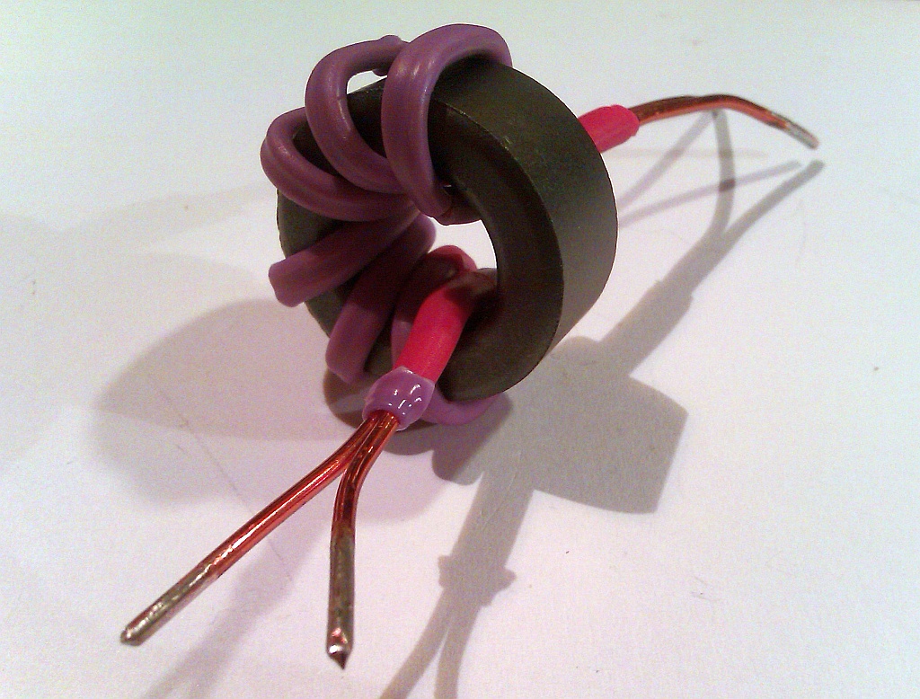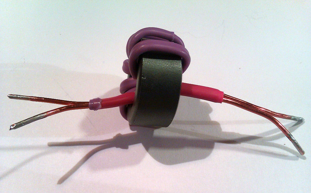 (27,5 mm x 15,5 mm x 12,5 mm) o nieznanej przenikalności i częstotliwości pracy. Na rdzeniu zmieściłem 6 zwojów drutu DNE 1,5 mm nawiniętych bifilarnie (2 odcinki po 30 cm).