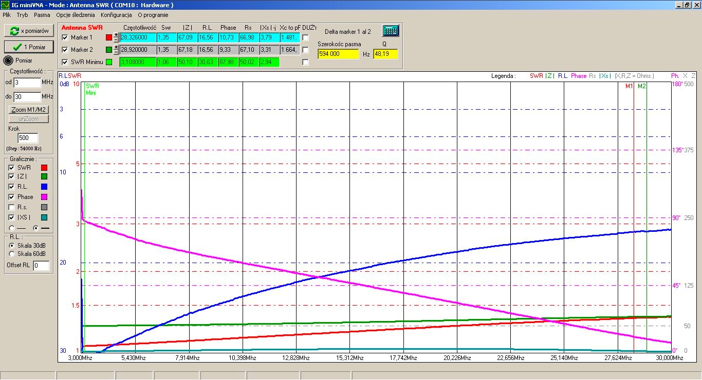 W pierwszym liście tego wątku zamieściłem pomiar kabla RG-316 (o długości 50 cm), który użyłem do zbudowania baluna prądowego 1:1. Wyniki pomiarów tak wykonanego baluna (na rdzeniu FT140-43) były raczej przeciętne. Szczególnie irytował mnie SWR, który dla częstotliwości 28,9 MHz wynosił 1,35. Również impedancja |Z| rosła od 50 Ohmów do niemal 67 Ohmów. Zresztą popatrzcie sobie na wykres; musicie się cofnąć na początek tego wątku - zgubiłem zrzut ekranu z miniMaxa