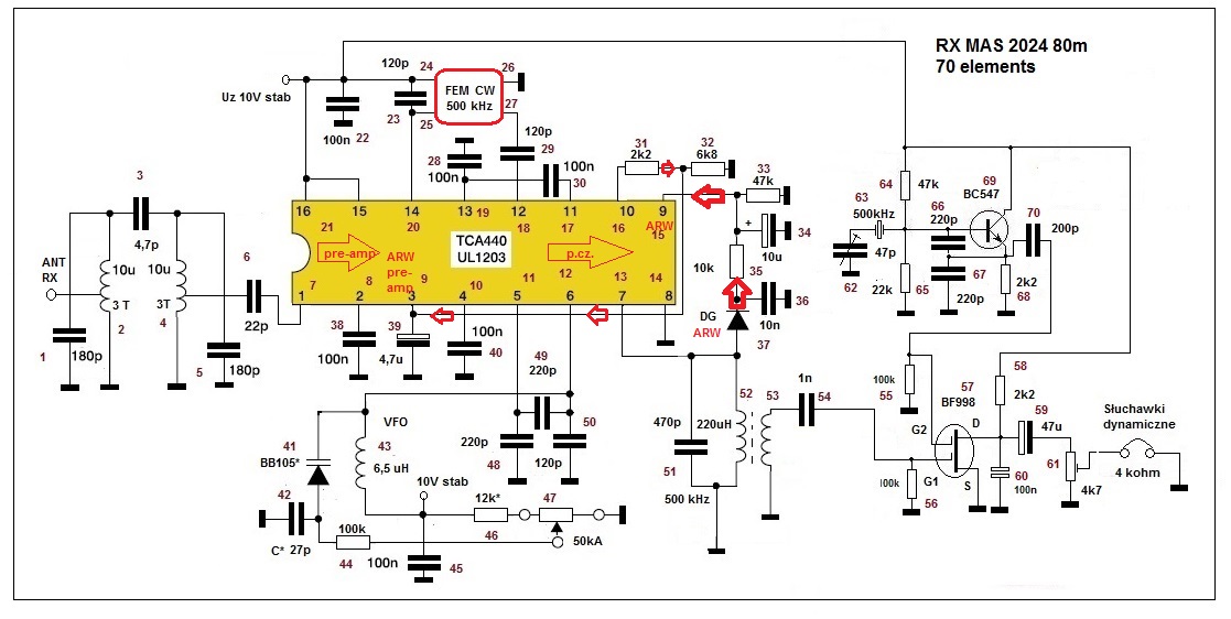 Opis toru ARW. Sygnał z p.cz. 500 kHz do ARW pobierany jest z wyjścia UL1203. Po detekcji podawany jest na wejście ARW wzmacniacza p.cz. pin 9. Na pin 10 jest wyjście do sterowania s-metrem, ale ja go wykorzystałem do sterowania wzmocnieniem wzmacniacza wejściowego (antenowego) z odpowiednio dobranym poziomem, tak by obniżanie wzmocnienia wzmacniacza wejściowego zaczynało się dopiero gdy sygnały mogą przesterowywać odbiornik. Sygnał arw z pin 10 przez dzielnik jest podawany na pin 3 - wejście regulacji wzmocnienia wzmacniaczem wejściowym, który jest przed FEM. Tym sposobem FEM jest objęty pętlą regulacji ARW.