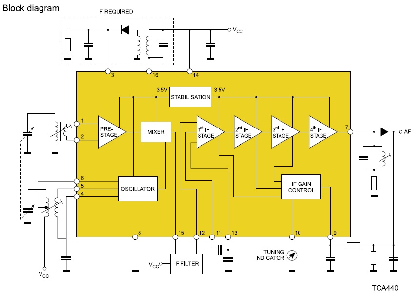 Struktura układu UL1203. Widać poszczególne bloki wzmacniaczy o ARW. W aplikacji "fabrycznej" stosują odrębną automatyczną regulację wzmacniacza wejściowego i p.cz. Zastanawiałem się nad ręczną regulacją wzmocnienia wzmacniacza wejściowego, ale ze względu na przeznaczenie odbiornika do pracy w zawodach "zautomatyzowałem" całą regulację wzmocnienia.