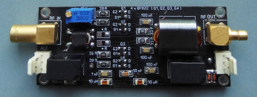 Możliwość wykonania front-end B-L-U: dotychczasowe BPF z zabudowanym na tej płytce załączanym pre-amp. W wersji uruchomieniowej jego wzmocnienie jest na poziomie ok 16dB. Obniżenie wzmocnienie tego przedwzmacniacza (nazwijmy go AMP1) do poziomu kompensującego starty BPF i mieszacza ok. 6-8dB. Dodanie przedwzmacniacza (nazwijmy AMP2) o regulowanym ręcznie wzmocnieniu 0-20dB.