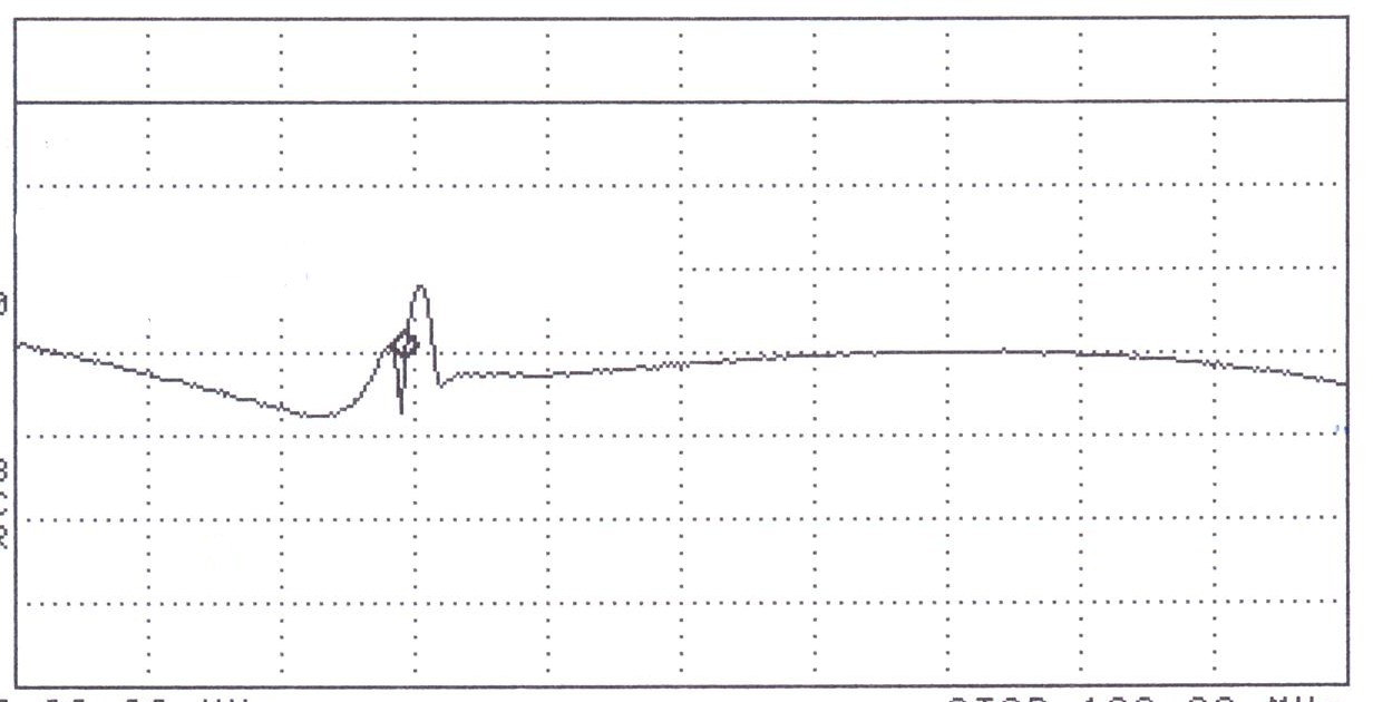 Pomiar ch-ki przenoszenia zawsze traktowałem jako pomiar wstępny. Właściwy pomiar i strojenie wykonuje się za pomocą mostka odbociowego. Dowolny analizator podłączamy do mostka, a ten dopiero do wejścia filtru. Filtr obciążamy prawidłowym i dokładnym rezystorem 50 omów. Obrazek, który uzyskamy na ekranie naszego wobulatora lub analizatora może wyglądać tak:
