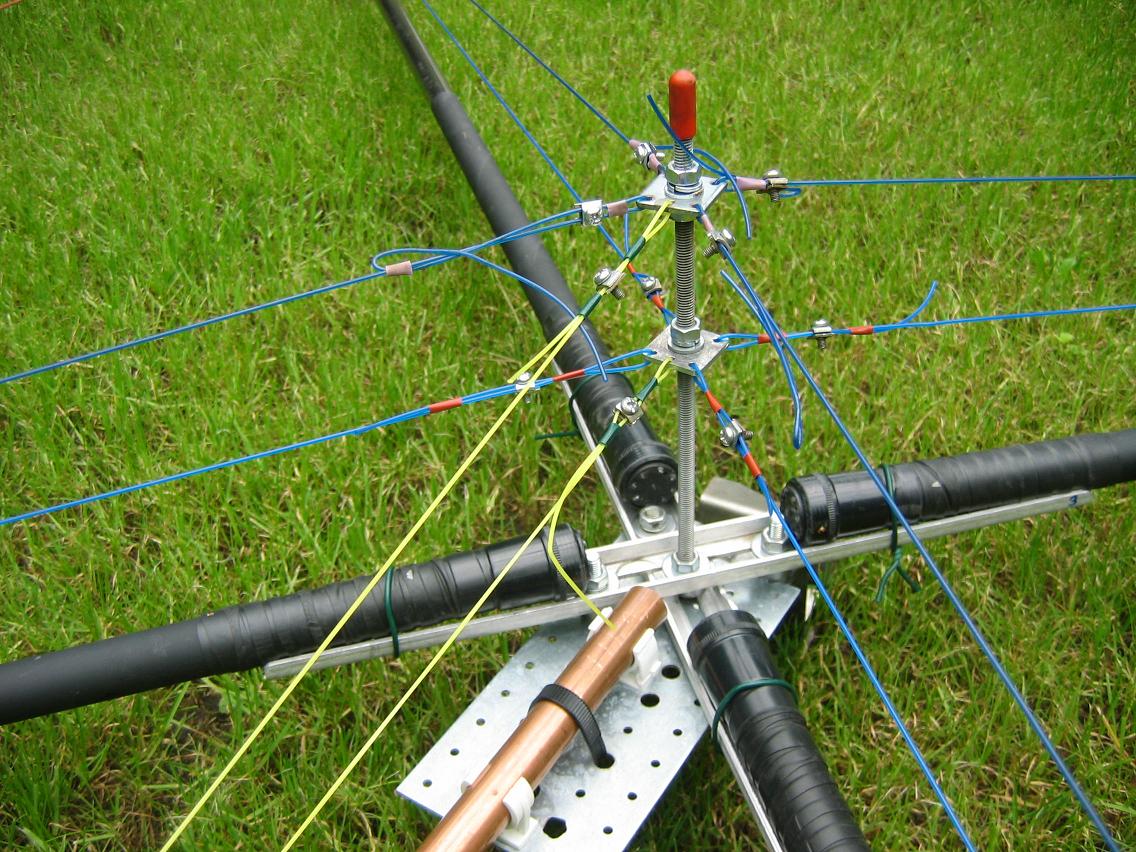 na bazie opisów dostępnych w internecie (G3TPW, G4ZFQ) wykonałem swoją wersje anteny CobWebb. Początkowo jako jedna ramkę na 14MHz, w trzech kolejnych podejściach dołożyłem ramki: 21 i 28MHz, 18 i 24MHz, oraz 10MHz (*). W efekcie powstała 6 pasmowa antena dookólną o polaryzacji poziomej. Ramkę na 14MHz wykonałem z przewodu głośnikowego 1,5mm2, pozostałe ramki z kabla PKL. Antena zasilana jest pojedynczym koncentrykiem przez balun prądowy 1:1. Wsporniki wykonałem z wędek z włókna węglowego (?) ("batów" o długości 4m bez dwóch ostatnich sekcji), podciągniętych za pomocą żyłek do elementu środkowego. Antena została pierwotnie zestrojona 2m nad ziemią i przeniesiona na dach (nie wymagała dużej korekty, również dokładanie następnych pasm nie spowodowało znaczącego rozstrojenia istniejących wcześniej ramek). Więcej szczegółów konstrukcyjnych -na zdjęciach.