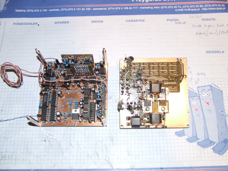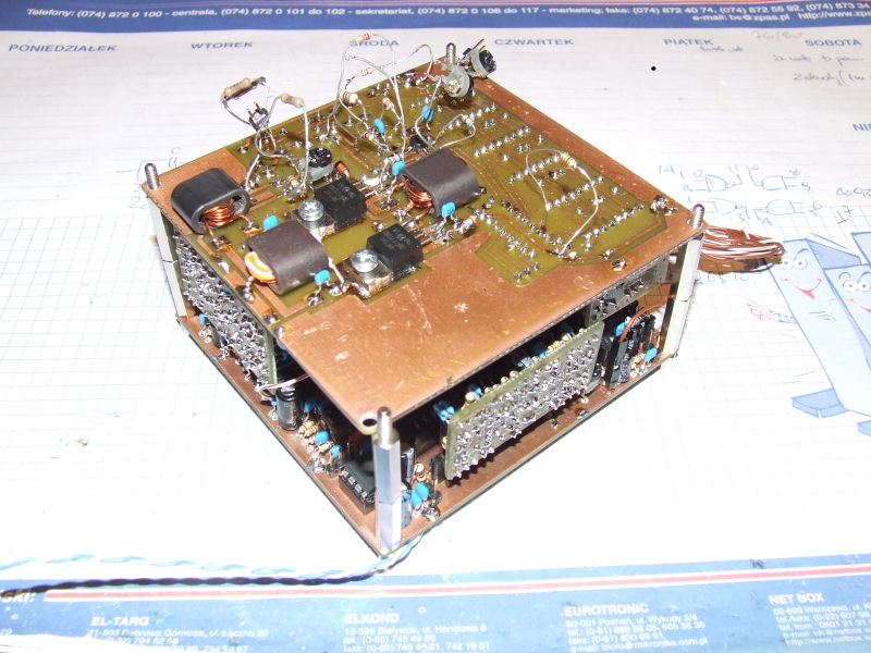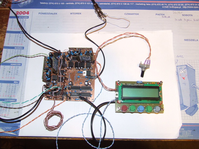 Na początek załączam schemat układu oraz kilka zdjęć przedstawiających jak powstawało urządzenie. Jak pisałem urządzenie już działa, odbiornik pracuje od 0 do 16MHz a nadajnik sprawdzałem pracując na 3.5 emisją cw wykonując kilkadziesiąt łączności z krajami całej Europy oraz emisją ssb z kilkoma kolegami z Polski. Logika zawarta w układzie DDS zapewnia za pomocą 5 klawiszy ustawienie częstotliwości wzorca DDS-a, przełączenie trybu pracy CW/SSB, przełączenie wstęgi USB/LSB, wybór jednego z VFO (F0 lub F1) zrównanie częstotliwości obu VFO (Fx=Fy) oraz ustawienie kroku przestrajania w zamkniętym cyklu 5Hz-> 50Hz-> 500Hz-> 5kHz-> 50kHz-> 500kHz-> 5Hz->50Hz.... Poza tym układ DDS steruje automatycznym przełączeniem oktawowych filtrów pasmowych w.cz. przy czym częstotliwości obu VFO mogą oczywiście leżeć w całym paśmie 0-16MHz.