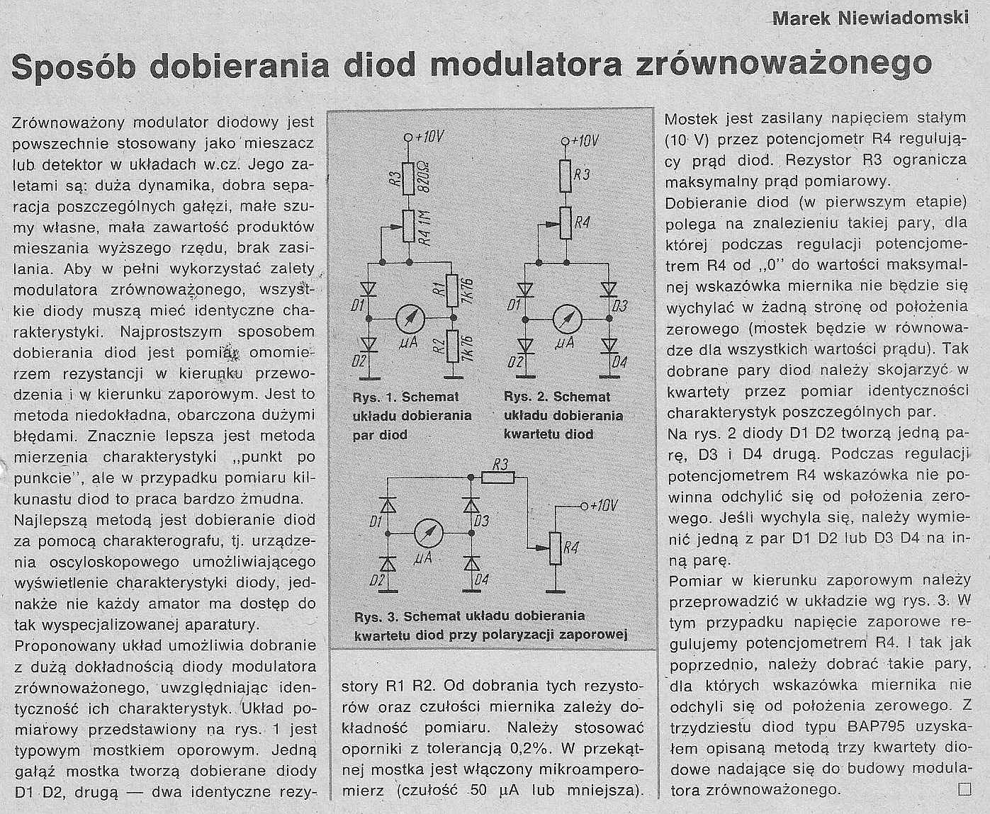 Panowie! Szkoda waszego czasu i nakładu pracy. Ja to robię tak: Wpinam wszystkie diody w "dekturkę" czyli podłużny kawałek kartonu. Jedna pod drugą ale "strzałką" w jedna stronę. Teraz uzbrajamy sie w kawałek cienko zaostrzonego ołówka , oraz miernik ( multimetr ) nastawiony na pomiar diód. Przewody od miernika wyposażamy w "krokodylki" w celu ułatwienia pomiaru. Następnie podpinamy miernik po kolei do każdej diody i mierzymy. Miernik nalezy posostawić podpiety dłużej ( ok 30 sekund) do każdej diody w celu ustabilizowania się prądów pomiaru. Po ok 30 sekundach ołóweczkiem piszemy rezultat obok każdej diody... Z dwudziestu nie raz można wybrać nawet dwa kwartety! Taki pomiar rzadko odbiega od pomiaru na drogich "warstatowych" instrumentach i umozliwia szybkie dobranie kwartetu. Jedno konkretne popołudnie zabawy aby pomierzyć wszystkie posiadane diody i ponotować rezultaty... Po czym mamy kwartet na wyciągnięcie ręki bo za każdym razem nie musimy "uruchamiać super drogiego multimetru " za całe sto złotych tylko wyciągamy kartoniki z diodami i zaglądamy do notakek na tychże kartonikach. WARUNEK : Dobra nowa bateria w multimetrze! Inaczej wyjdą historie nie przewidziane. A tak - mamy dwadzieścia diód , zapinamy na kartonik, godzina roboty i mamy wszystko pomierzone na dodatek z zapasem. Bo zależy od tego jakie diody można z dwudziestu nawet dwa kwartety śmiało uzyskać. Z mojego doświadczenia wynika że najlepiej wychodzą pomiary naszych polskich AAP xx , potem DOG. Jeszcze lepsze są rosyjskie ( po radzieckie ) tak na dwadzieścia,- sześć się powtarza! Najgorsze sa diody Schotky'ego... Z dwudziestu DWIE się nadały ale wsadziłem je do detektora FM , przynajmniej mam odbiór radiofonii jak trzeba, moja Dana odżyła. Polecam ! Kawałek kartonu, ołówek i multimetr. Po co robić drogi i pracochłonny "super układ" ? według mnie to przerost formy nad treścią.
